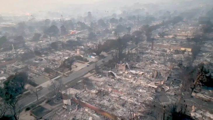 Αποκαρδιωτικά πλάνα από drone αποτυπώνουν τεράστιες περιοχές του Λος Άντζελες που θυμίζουν εμπόλεμη ζώνη, καθώς οι καταστροφικές φωτιές συνεχίζουν να μαίνονται ανεξέλεγκτες. Ο σερίφης της κομητείας, Ρόμπερτ Λούνα, δήλωσε χαρακτηριστικά: «Μοιάζει σαν να έπεσε ατομική βόμβα σε αυτές τις περιοχές».