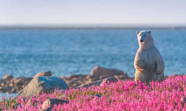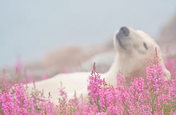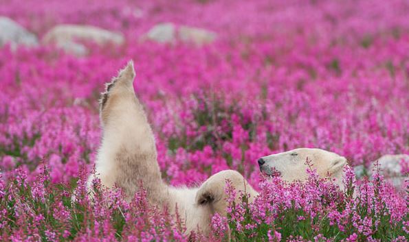 Ο Καναδός φωτογράφος άγριας ζωής Dennis Fast κατέγραψε με την κάμερά του ένα μοναδικό και σπάνιο στιγμιότυπο. Δύο πολικές αρκούδες παίζουν σε ένα ανθισμένο λιβάδι στη Manitoba του Καναδά και κερδίζουν τα βλέμματα.