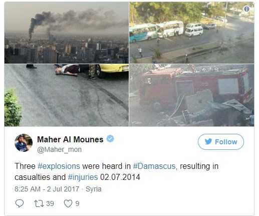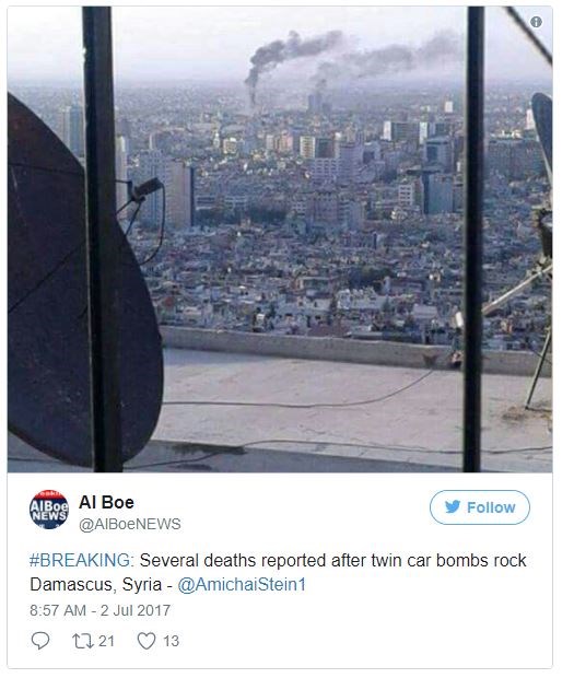 “Οι αρχές καταδίωξαν τρία παγιδευμένα με εκρηκτικά αυτοκίνητα και κατάφεραν να προκαλέσουν έκρηξη σε δύο από αυτά στην είσοδο της Δαμασκού, στον δρόμο προς το αεροδρόμιο. Περικύκλωσαν το τρίτο αυτοκίνητο στην πλατεία Ταχρίρ, όπου ο τρομοκράτης πυροδότησε τα εκρηκτικά, προκαλώντας έναν αριθμό νεκρών και τραυματιών”, ανέφερε η κρατική τηλεόραση.