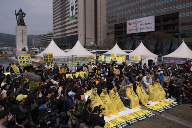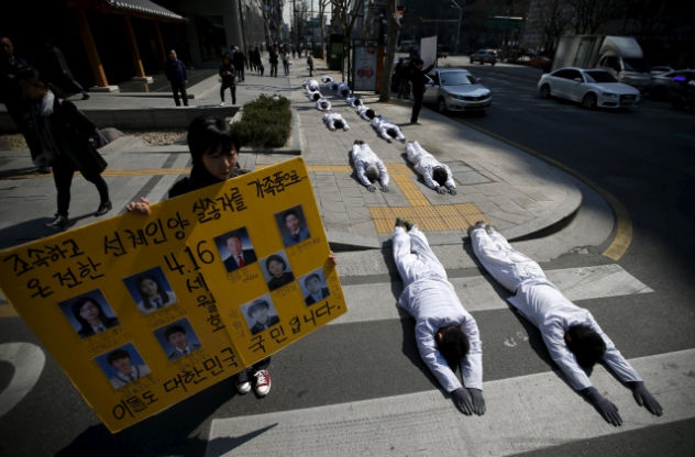 Το οχηματαγωγό των 6.825 τόνων βυθίσθηκε στις 16 Απριλίου 2014 στα ανοικτά του νότιου νησιού Τζίνγκο ενώ μετέφερε 476 επιβάτες και μέλη του πληρώματος. Από τα 304 θύματα, τα 250 ήταν μαθητές γυμνασίου που σπούδαζαν στο ίδιο σχολείο. “Σχεδόν ένας χρόνος πέρασε από την τραγωδία, όμως η πρόεδρος δεν τήρησε την υπόσχεσή της. Πηγαίνουμε στη Σεούλ για να μάθουμε νέα”, δήλωσε ο Σουν Μιεόνγκ-Σαν, ένας εκπρόσωπος των οικογενειών. Στις 2 Απριλίου, περίπου 50 πατέρες και μητέρες επιβατών που έχασαν τη ζωή τους στο ναυάγιο ξύρισαν δημόσια το κεφάλι τους στη Σεούλ σε ένδειξη πένθους και αποφασιστικότητας. Άλλοι έκαναν το ίδιο σήμερα πριν από την έναρξη της πορείας και ορισμένοι γονείς κρατούσαν κλαίγοντας φωτογραφίες των νεκρών παιδιών τους.