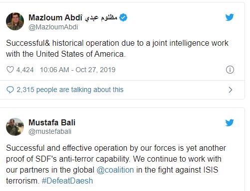 “Μια ιστορική, επιτυχημένη επιχείρηση, αποτέλεσμα της συνεργασίας σε επίπεδο πληροφοριών με τις ΗΠΑ”, έγραψε ο Μάζλουμ Άμπντι στο Twitter, αν και δεν επιβεβαίωσε ξεκάθαρα τον θάνατο του αλ Μπανγκντάντι.