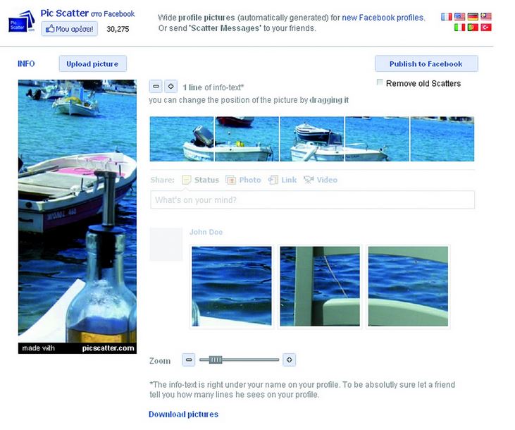 Για να ξεκινήσετε τη διαδικασία, επισκεφτείτε τη διεύθυνση picscatter.com και επιλέξτε την εντολή upload picture. Όταν τελειώσετε µε τους πειραματισμούς σας, κάνετε κλικ στο Publish to Facebook. Tο PicScatter διαθέτει µερικές λειτουργίες που δεν έχει το Schweppes. Κατ’ αρχάς, μπορεί να κατεβάσει όλες τις φωτογραφίες σε ένα αρχείο zip [µε κλικ στο download pictures] και στη συνέχεια να τις ανεβάσετε χειροκίνητα στο Facebook, αν το επιθυμείτε.