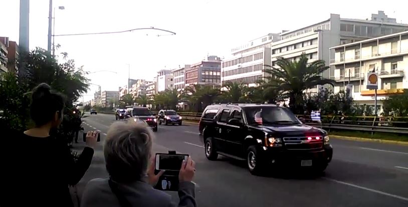 Τη θέση των δύο θωρακισμένων Cadillac – γνωστών και ως «Beast» – πήραν τα δύο Chevrolet Suburban, τα οποία έφεραν την ελληνική και την αμερικάνικη σημαία και σε ένα εκ των οποίων επέβαινε ο Μπαράκ Ομπάμα.