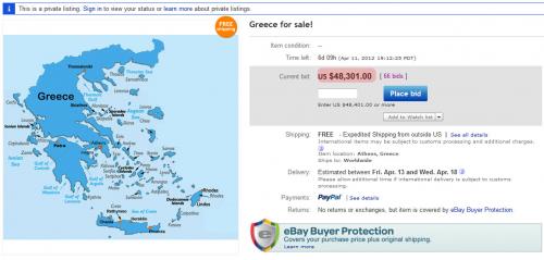 “Προσφέρω για πώληση τη χώρα μου. Ό,τι έχει απομείνει, τουλάχιστον. Ελαφρώς χρησιμοποιημένη, με χαμηλούς μισθούς, με χαμηλές συντάξεις, με χαμηλές προσδοκίες. Με πολύ ηλιοφάνεια όμως, χωρίς κάποια χρέωση μέχρι στιγμής”.Πολλοί φυσικοί πόροι, ορυκτά, κτλ. ακόμη ανέγγιχτα. Γραφειοκρατία στα καλύτερα της. Φοβερό σύστημα δωροδοκήστε-για-να-κάνετε-κάτι, με εμπειρία 20 ετών.Υπακοή στους ΔΝΤ, τραπεζίτες και την Τρόικα είναι εγγυημένη, χωρίς ερωτήσεις.Ο αγοραστής θα πάρει δωρεάν 300 πολιτικούς, άριστα εκπαιδευμένους στο Πανεπιστήμιο Καλών Τεχνών για Σκάνδαλα. Και δωρεάν τα ελληνικά ομόλογα με εξαιρετικά υψηλή τιμή στη διεθνής αγορά. Για κομφετί.Θα σας δώσω το καλύτερο πιστοποιητικό που μπορείτε να φανταστείτε, ακόμη και ένα ειδικά διαμορφωμένο για σας, αν το ζητήσετε.Υ.Γ. No hard feelings! (ελεύθερη μετάφραση=όλα ΟΚ, μην έχετε κακά συναισθήματα)”Αυτή είναι η περιγραφή που υπήρχε στο ebay στην αγγελία για την πώληση της Ελλάδας… Η αρχική τιμή ήταν στα 1.525 δολάρια, ενώ γρήγορα έφτασε στις 48.301 δολάρια.