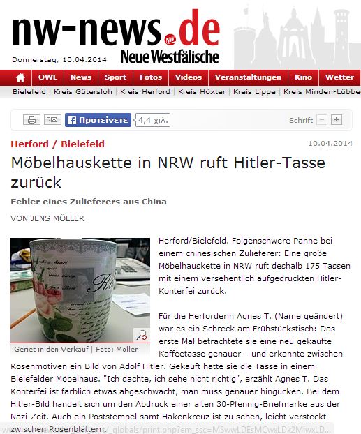 Ένα κατάστημα επίπλων στη Γερμανία απέσυρε από την κυκλοφορία 5.000 φλιτζανάκια και κανάτες του καφέ, κατασκευασμένα στην Κίνα, καθώς έφεραν ανάγλυφο ένα αναμνηστικό γραμματόσημο με τη φωτογραφία του Αδόλφου Χίτλερ.