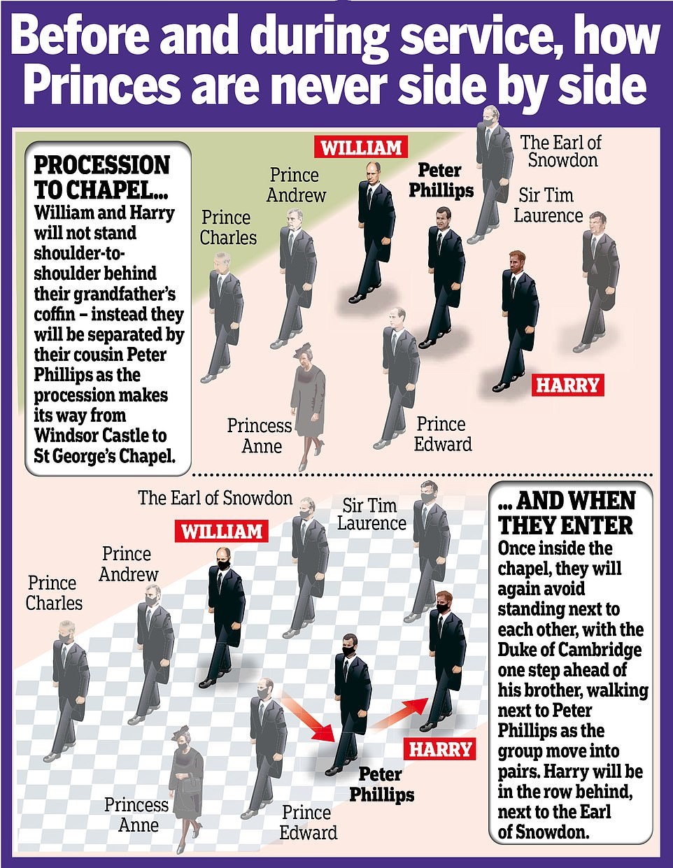 Με εντολή της βασίλισσας, όλα τα ανώτατα μέλη της βασιλικής οικογένειας θα φορούν πένθιμα ρούχα και όχι στρατιωτικές στολές, ώστε να βγει από τη δύσκολη θέση ο πρίγκιπας Χάρι καθώς μετά το Megxit, και την επίσημη παραίτηση από τα πριγκιπικά του καθήκοντα του αφαιρέθηκαν και οι στρατιωτικοί τίτλοι. Τα δύο αδέλφια Χάρι και Ουίλιαμ δεν θα περπατήσουν δίπλα δίπλα στην πομπή πίσω από το φέρετρο του παππού τους, πάλι σύμφωνα με εντολή της βασίλισσας, ούτε θα σταθούν ο ένας δίπλα στον άλλον μέσα στο παρεκκλήσι, αφού ανάμεσά τους θα βρεθεί ο ξάδελφός τους, Πίτερ Φίλιπς.