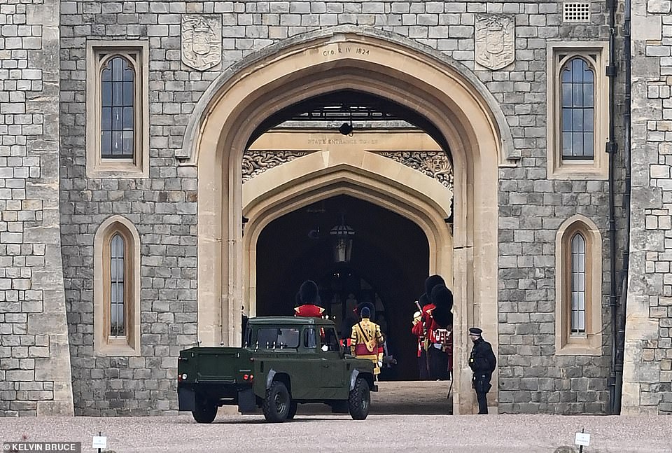 14.27 Το ειδικά διαμορφωμένο Land Rover θα μεταφέρει το φέρετρο, θα φθάσει στην Πύλη του Γεωργίου του Δ’ και θα ακολουθήσει τη φορά των δεικτών του ρολογιού γύρω από το Quadrangle (Τετράγωνο) στην Είσοδο του Ιππικού