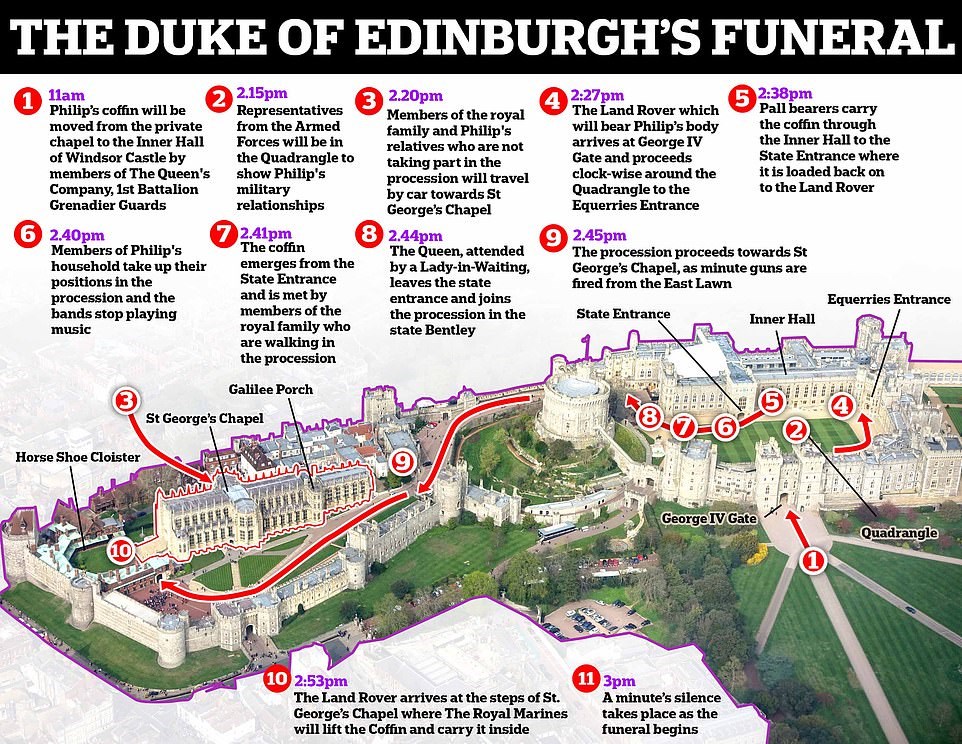Σύμφωνα με όσα έχουν γίνει γνωστά τις προηγούμενες ημέρες, η κηδεία ξεκινά στις 15.00 τοπική ώρα και θα γίνει στο Παρεκκλήσι του Αγίου Γεωργίου στο Κάστρο του Ουίνδσορ. Η ταφή θα γίνει στους Κήπους στο Φρόγκμορ. Η μεταφορά του φέρετρου θα γίνει με το ειδικά διαμορφωμένο Land Rover που ο ίδιος ο πρίγκιπας Φίλιππος βοήθησε στον σχεδιασμό του.