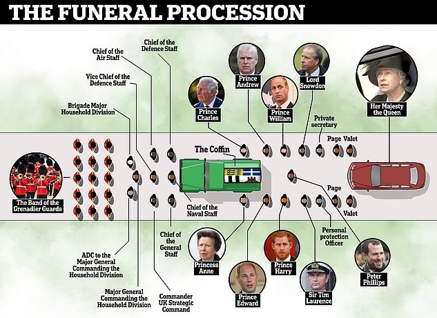 Η μεταφορά του φέρετρου θα γίνει με το ειδικά διαμορφωμένο Land Rover που ο ίδιος ο πρίγκιπας Φίλιππος βοήθησε στον σχεδιασμό του. Με εντολή της βασίλισσας, όλα τα ανώτατα μέλη της βασιλικής οικογένειας θα φορούν πένθιμα ρούχα και όχι στρατιωτικές στολές, ώστε να βγει από τη δύσκολη θέση ο πρίγκιπας Χάρι καθώς μετά το Megxit, και την επίσημη παραίτηση από τα πριγκιπικά του καθήκοντα του αφαιρέθηκαν και οι στρατιωτικοί τίτλοι. Τα δύο αδέλφια Χάρι και Ουίλιαμ δεν θα περπατήσουν δίπλα δίπλα στην πομπή πίσω από το φέρετρο του παππού τους ούτε θα σταθούν ο ένας δίπλα στον άλλον μέσα στο παρεκκλήσι, αφού ανάμεσά τους θα βρεθεί ο Πίτερ Φίλιπς, σε ρόλο διαμεσολαβητή.
