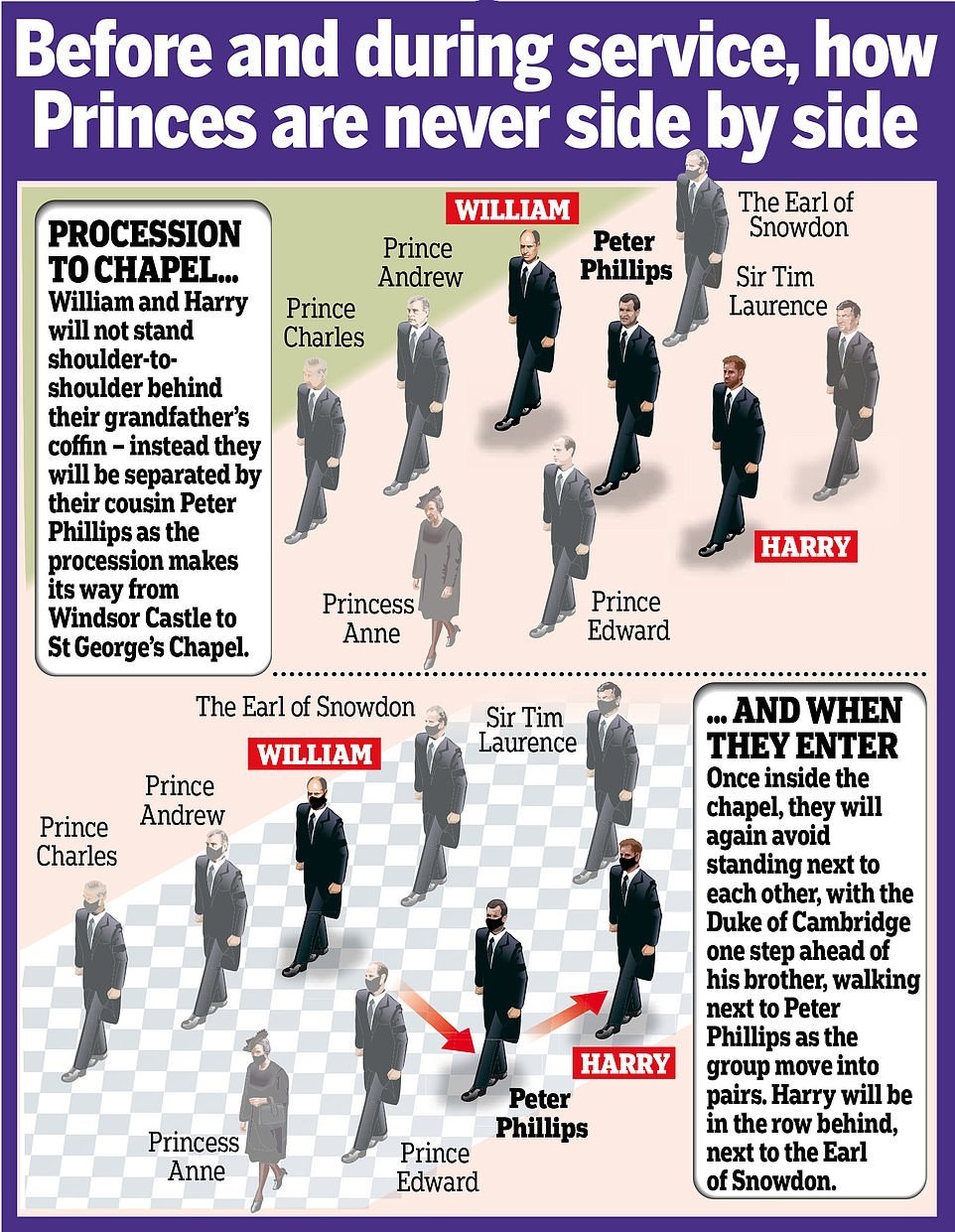 Μόνο 30 άνθρωποι θα επιτραπεί να είναι παρόντες στην κηδεία λόγω των κανονισμών που έχουν επιβληθεί εξαιτίας της Covid-19. Σ’ αυτούς περιλαμβάνονται η βασίλισσα, όλα τα ανώτερα μέλη της βασιλικής οικογένειας, περιλαμβανομένων των εγγονών του δούκα, και μέλη της οικογένειας του πρίγκιπα Φιλίππου, μεταξύ των οποίων ο Μπέρνχαρντ, ο Κληρονομικός Πρίγκιπας του Μπάντεν, και ο πρίγκιπας Φίλιππος του Χοενλόε-Λάνγκενμπουργκ. Τα μέλη της βασιλικής οικογένειας θα φορούν επίσημη πρωινή ενδυμασία με παράσημα. Το εκκλησίασμα θα συμμορφωθεί με τις οδηγίες για τον κορονοϊό που ισχύουν για όλη τη χώρα και θα φορά μάσκες κατά την 50λεπτη τελετή. Μια μικρή τετραμελής χορωδία θα τραγουδήσει μουσικά κομμάτια που είχε επιλέξει ο πρίγκιπας πριν από τον θάνατό του, χωρίς συνοδεία από το εκκλησίασμα. Η βασίλισσα θα κάθεται μόνη της στη διάρκεια της τελετής.