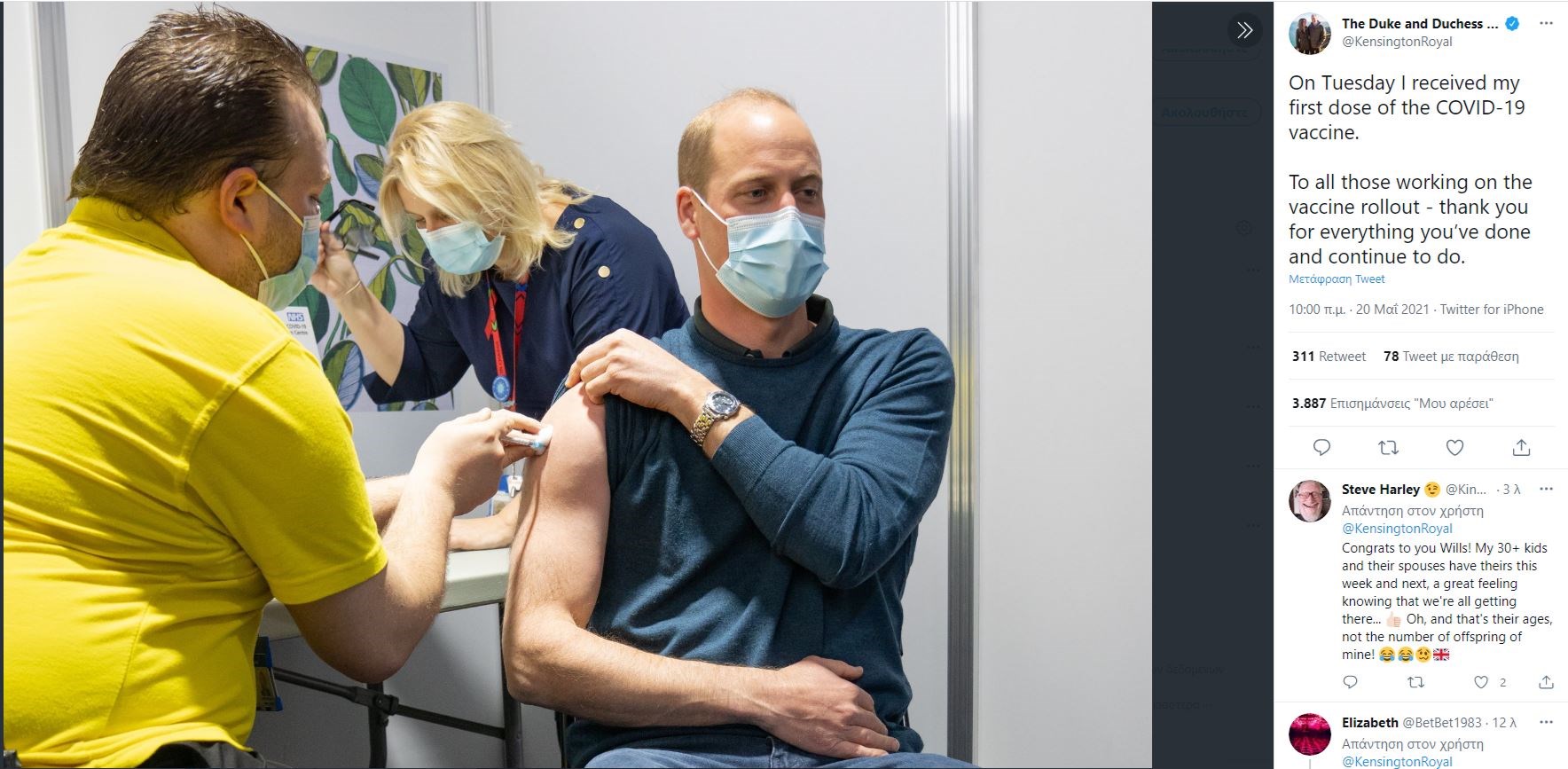 Ανέβασε τη σχετική φωτογραφία του στους λογαριασμούς που διατηρεί ο ίδιος και η σύζυγός του Κέιτ Μίντλετον στα social media, και έγραψε στη λεζάντα: “Την Τρίτη έλαβα την πρώτη δόση του εμβολίου μου κατά της Covid-19. Σε όλους αυτούς που εργάζονται στο εμβολιαστικό πρόγραμμα – σας ευχαριστώ για όλα όσα έχετε κάνει και συνεχίζετε να κάνετε”.