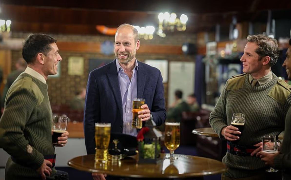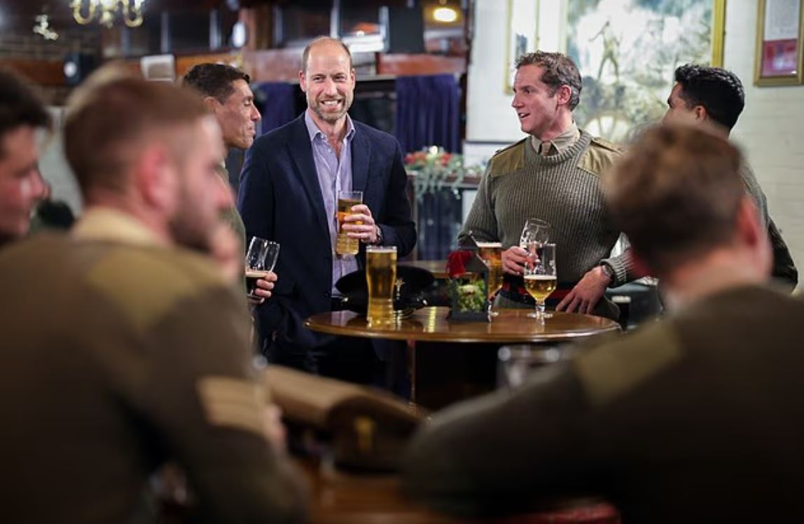 Μετά το γεύμα, ο Ουίλιαμ  – ο οποίος έχει το χαϊδευτικό παρατσούκλι «One Pint Willy» (Ο Ουίλι της Μπύρας) από τον σύζυγο της ξαδέλφης του Ζάρα, Μάικ Τίνταλ, επειδή «δεν είναι και ο καλύτερος πότης» – έμεινε πίσω για να απολαύσει μια μπύρα με τους στρατιώτες των οποίων είναι διοικητής.