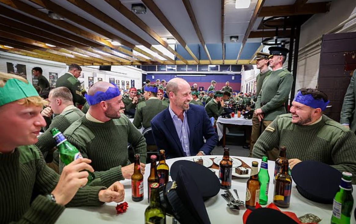 Μετά το γεύμα, ο Ουίλιαμ  – ο οποίος έχει το χαϊδευτικό παρατσούκλι «One Pint Willy» (Ο Ουίλι της Μπύρας) από τον σύζυγο της ξαδέλφης του Ζάρα, Μάικ Τίνταλ, επειδή «δεν είναι και ο καλύτερος πότης» – έμεινε πίσω για να απολαύσει μια μπύρα με τους στρατιώτες των οποίων είναι διοικητής.