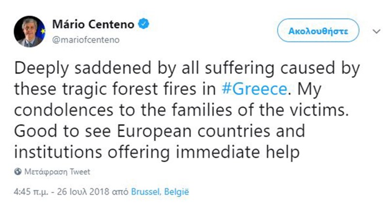 Με ανάρτηση στον προσωπικό του λογαριασμό στο twitter, ο Μάριο Σεντένο εκφράζει τα συλλυπητήριά του προς τις οικογένειες των θυμάτων και επισημαίνει: «Καλό είναι να βλέπουμε τις ευρωπαϊκές χώρες και τα θεσμικά όργανα να προσφέρουν άμεση βοήθεια».