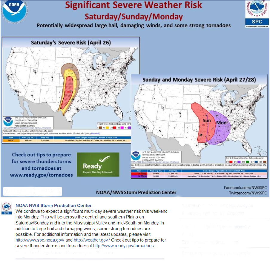 Πριν από λίγες ώρες η Εθνική Μετεωρολογία των ΗΠΑ (ΝΟΑΑ) ανακοίνωσε πως το δελτίο ακραίων-επικίνδυνων καιρικών φαινομένων συνεχίζει να βρίσκεται σε ισχύ όσον αφορά το ερχόμενο Σαββατοκύριακο 26-27 Aπριλίου για τις Πολιτείες (Central and Southern Plains): Nebraska, Missouri, Kansas, Minnesota Arkansas, New Mexico, Oklahoma, and Texas και την ερχόμενη Δευτέρα 28 Απριλίου για τις Πολιτείες (mid-South): Tennessee, Mississippi, Kentucky, Arkansas, Illinois and Alabama) έως και την κοιλάδα του Μισισιπή.