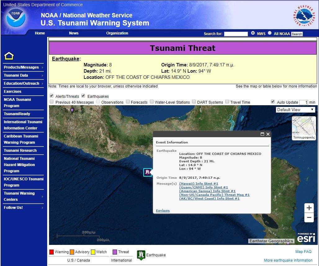 Το Αμερικανικό Κέντρο Προειδοποίησης Τσουνάμι του Ειρηνικού προειδοποίησε ότι υπάρχουν πιθανότητες να σχηματιστούν κύματα τσουνάμι από τον ισχυρό σεισμό των 8 Ρίχτερ που έπληξαν το Μεξικό.