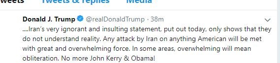 “Η αδαής και πολύ προσβλητική ανακοίνωση που έκανε σήμερα το Ιράν δείχνει μόνο ότι δεν αντιλαμβάνονται την πραγματικότητα. Οποιαδήποτε επίθεση του Ιράν εναντίον οτιδήποτε αμερικανικό θα αντιμετωπιστεί με τη μεγαλύτερη και συντριπτική ισχύ. Σε ορισμένους τομείς, συντριπτική σημαίνει αφανισμός”, έγραψε σε ανάρτησή του στο Twitter.