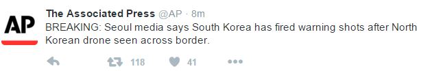 Σύμφωνα με τα όσα αναφέρουν μέσα ενημέρωσης από την πρωτεύουσα της Νότιας Κορέας, Σεούλ και αναμεταδίδει το Associated Press, η Ν. Κορέα εξαπέλυσε προειδοποιητικά πυρά κατά ενός drone της Βόρειας Κορέας που εντόπισε στα σύνορά της.