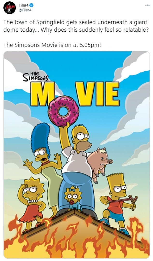 Στην ταινία των Σίμπσον, οι κάτοικοι του Σπρίνγκφιλντ βλέπουν έναν τεράστιο γυάλινο θόλο να σκεπάζει την πόλη τους, με τους φαν της σειράς να συσχετίζουν αυτήν τη σκηνή με τους περιορισμούς που έχουν τεθεί από πόλη σε πόλη στη Βρετανία, στην οποία τώρα, εν μέσω της υγειονομικής κρίσης, έχει επιβληθεί ένα σύστημα διαχωρισμού ανάλογα με το επίπεδο κινδύνου από τον ιό. Το Λονδίνο όπως και εγχώριες κομητείες, καθώς και πολλές άλλες περιοχές βρίσκονται στην κατηγορία 4, η οποία είναι ουσιαστικά ένα άλλο lockdown. Σύμφωνα με τους κανόνες, αυτοί που βρίσκονται στην κατηγορία 4 δεν μπορούν να βγουν από αυτήν.