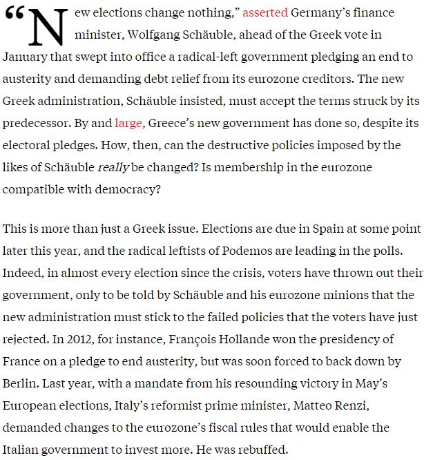 Σύμφωνα με τον αρθρογράφο, «σε μεγάλο βαθμό, η νέα κυβέρνηση λειτούργησε με αυτό τον τρόπο, παρά τις προεκλογικές δεσμεύσεις της». «Αυτό δεν αποτελεί μόνο ένα ελληνικό ζήτημα. Εκλογές αναμένονται στην Ισπανία αργότερα φέτος, ενώ οι ριζοσπαστικοί αριστεροί του Podemos προηγούνται στις δημοσκοπήσεις. Πράγματι, σε όλες σχεδόν τις εκλογές, μετά το ξέσπασμα της κρίσης, οι ψηφοφόροι ανέτρεψαν τις κυβερνήσεις τους, για να ζητήσει αμέσως μετά ο Σόιμπλε και οι προστατευόμενοί του στην ευρωζώνη ότι πρέπει η νέα κυβέρνηση να μείνει προσκολλημένη στις αποτυχημένες πολιτικές που μόλις είχαν απορρίψει οι ψηφοφόροι», σημειώνει.