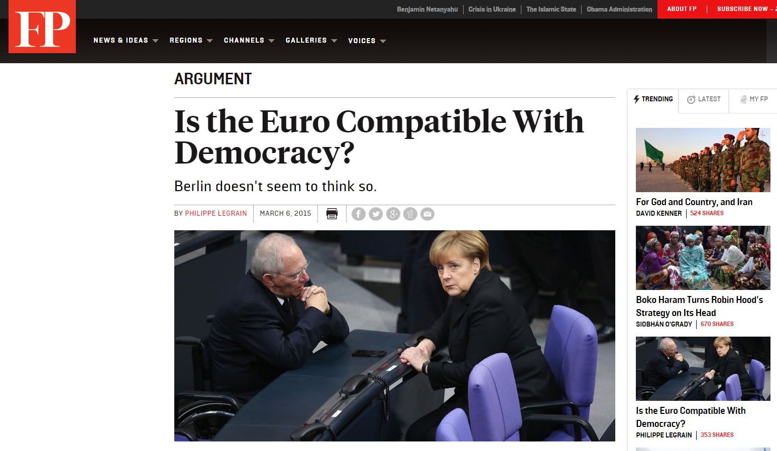 «Πώς μπορούν να αλλάξουν οι καταστροφικές πολιτικές που επιβάλλει ο Σόιμπλε και οι όμοιοί του; Είναι συμβατή η ένταξη στην ευρωζώνη με τη Δημοκρατία;» διερωτάται ο Φιλίπ Λεγκρέν, πρώην οικονομικός σύμβουλος του προέδρου της Ευρωπαϊκής Επιτροπής την περίοδο 2011-2014, Ζοζέ Μανουέλ Μπαρόζο, σε άρθρο του στο περιοδικό Foreign Policy.