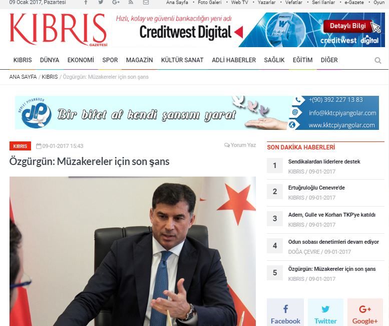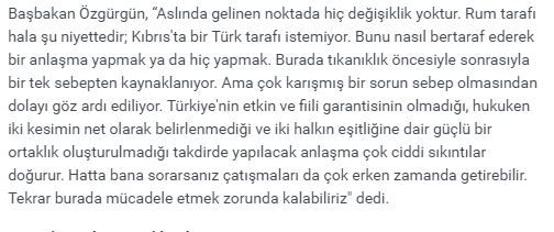 «Δεν υπάρχει καμία αλλαγή στο σημείο των διαπραγματεύσεων, η ελληνική πλευρά δεν θέλει την τουρκική στην Κύπρο. Αυτό είτε θα ξεπεραστεί για να υπάρξει συμφωνία είτε όχι και δεν θα υπάρξει κάτι», δήλωσε σε συνέντευξη του στο πρακτορείο İhlas Haber Ajansı ο Πρωθυπουργός του ψευδοκράτους, Χουσεΐν Οζγκιουργκούν.