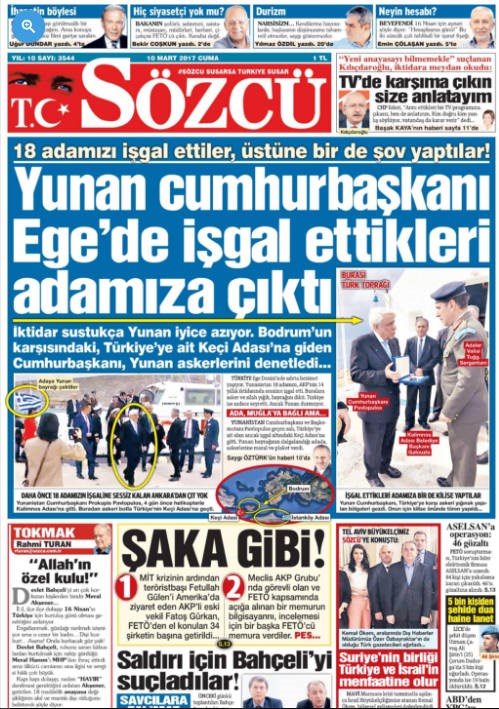 Πρωτοσέλιδο τουρκικής εφημερίδας ανεβάζει εκ νέου την θερμοκρασία με τη γείτονα, καθώς αναφερόμενη στην επίσκεψη Παυλόπουλου στην Ψέριμο, λέει χαρακτηριστικά ότι «Ο Έλληνας πρόεδρος, ανέβηκε στο νησί μας, το οποίο κατέλαβαν».Οι προκλήσεις από την Τουρκία με τις συνεχείς παραβιάσεις σε θαλάσσιο και εναέριο χώρο καθώς και τις επιθέσεις σε πολιτικό επίπεδο, έχουν γίνει καθημερινό φαινόμενο και συνεχίζονται σήμερα με το σημερινό πρωτοσέλιδο εξώφυλλο της SÖZCÜ όπου κατηγορεί τον Προκόπη Παυλόπουλο που επισκέφτηκε την Ψέριμο.«O Έλληνας πρόεδρος ανέβηκε στο νησί μας, το οποίο κατέλαβαν. Μας πήραν τα 18 νησιά μας και από πάνω κάνουν και σόου», αναφέρει η εφημερίδα η οποία σε ένα ανιστόρητο παραλήρημα διεκδικεί ελληνικά εδάφη.Μάλιστα η πρόκληση συνεχίζεται με το ρεπορτάζ να αναφέρει «Όσο η κυβέρνηση σιωπά τόσον ο Έλληνας ξεσηκώνεται. Ο πρόεδρος (ο Προκόπης Παυλόπουλος) πήγε στο “τουρκικό νησί Keçi” Ψεριμος που είναι απέναντι από την Αλικαρνασσού και επιθεώρησε τους στρατιώτες».Μάλιστα, αξίζει να σημειωθεί ότι η συγκεκριμένη εφημερίδα δεν είναι «ερντογανική», αλλά αντιπολιτευόμενη.