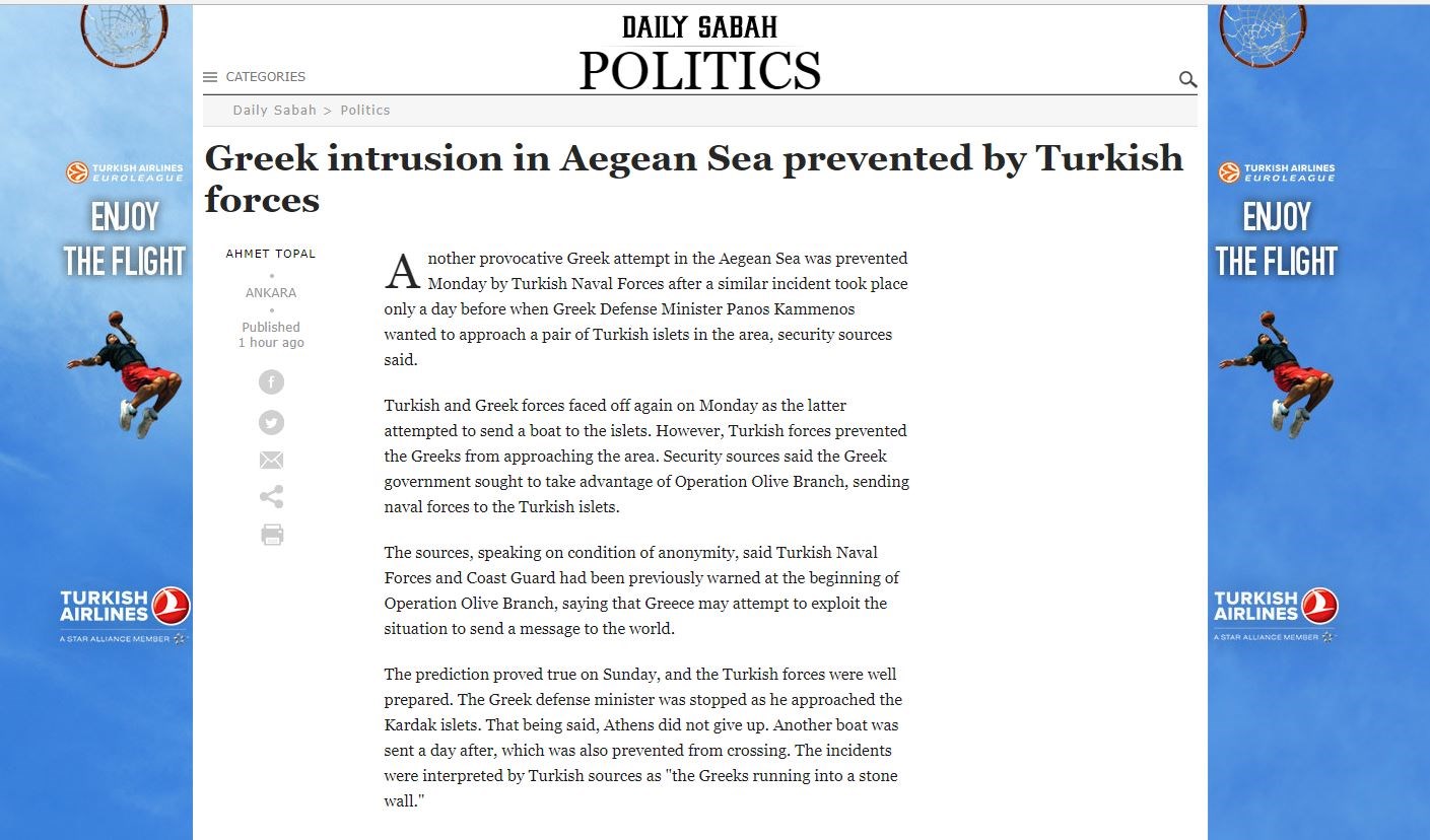 Σύμφωνα με αυτό το ρεπορτάζ, ο τουρκικός στρατός στο Αιγαίο βρίσκεται σε επιφυλακή, καθώς έχουν λάβει πληροφορίες ότι η Ελλάδα σκοπεύει να εκμεταλλευτεί το γεγονός ότι η Τουρκία έχει στραμμένο το βλέμμα της προς την επιχείρηση στη Συρία «Κλάδος Ελαίας» και να στείλει ναυτικές δυνάμεις στις «τουρκικές» βραχονησίδες Ίμια. Στο δημοσίευμα “αποκαλύπτεται” ότι μία τέτοια προσπάθεια έγινε την περασμένη Δευτέρα όταν το τουρκικό πολεμικό ναυτικό απέτρεψε μία «προβοκατόρικη» ενέργεια της Ελλάδας στο Αιγαίο, ενώ μία ημέρα πριν ο Έλληνας υπουργός Άμυνας ήθελε επίσης να προσεγγίσει τις βραχονησίδες των Ιμίων.