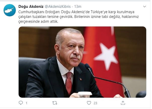 «Έχουμε αποδείξει μέχρι σήμερα ότι δεν εποφθαλμιούμε εδάφη και κυριαρχία κανενός, ειδικά επί των φυσικών πηγών ενέργειας. Παρά τις ανηθικότητες που αντιμετωπίζουμε, εμείς δεν θα αλλάξουμε την κατεύθυνση που μας έχει υποδείξει η πίστη και η ιστορία μας», είπε ακόμη ο Τούρκος Πρόεδρος.