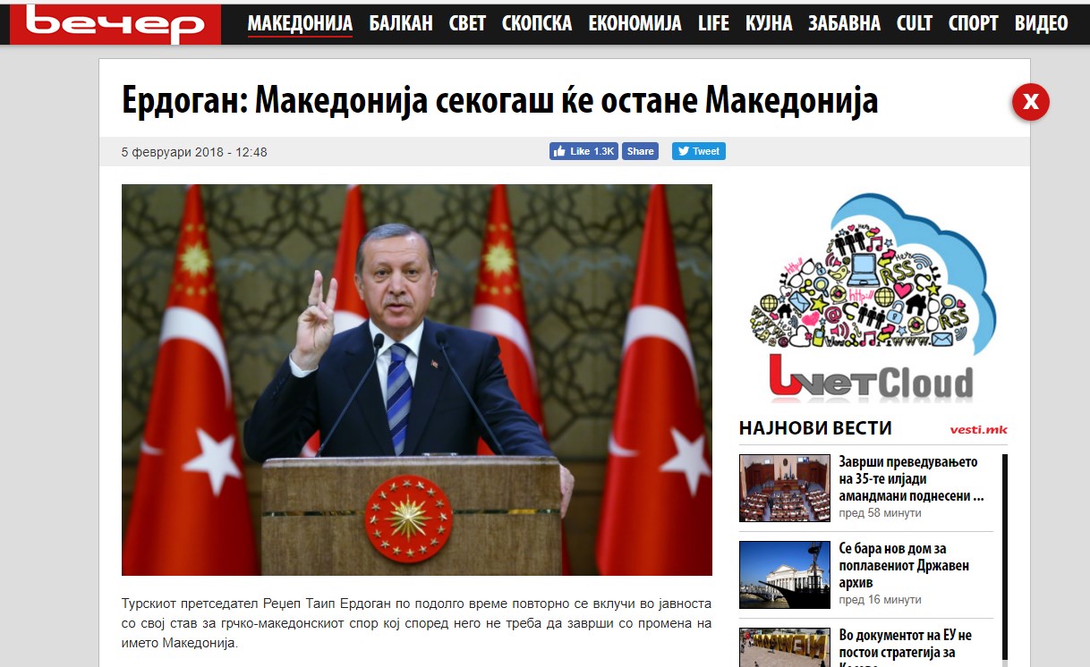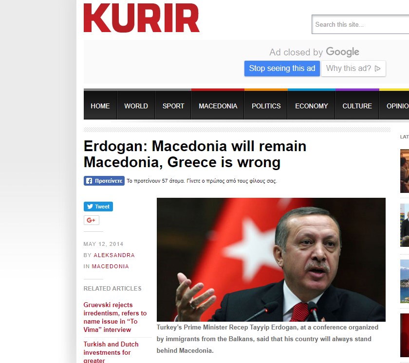 Ωστόσο, συμπτωματικά ακριβώς την ίδια δήλωση Ερντογάν είχαν μεταδώσει τα Σκοπιανά ΜΜΕ και τον Μάιο του 2014. Άγνωστο για ποιον λόγο, πολλά ΜΜΕ της γειτονικής χώρας, αλλά και της Βουλγαρίας, αποφάσισαν εν μέσω διαπραγμάτευσης να αναπαράγουν ξανά την συγκεκριμένη δήλωση, που σημειωτέον δεν φιλοξενείται από κανένα τουρκικό μέσο.