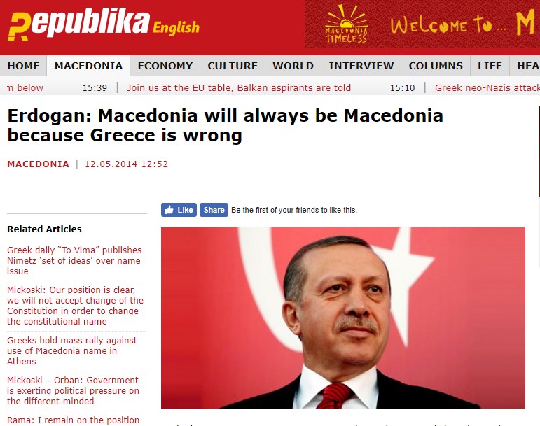 Ωστόσο, συμπτωματικά ακριβώς την ίδια δήλωση Ερντογάν είχαν μεταδώσει τα Σκοπιανά ΜΜΕ και τον Μάιο του 2014. Άγνωστο για ποιον λόγο, πολλά ΜΜΕ της γειτονικής χώρας, αλλά και της Βουλγαρίας, αποφάσισαν εν μέσω διαπραγμάτευσης να αναπαράγουν ξανά την συγκεκριμένη δήλωση, που σημειωτέον δεν φιλοξενείται από κανένα τουρκικό μέσο.