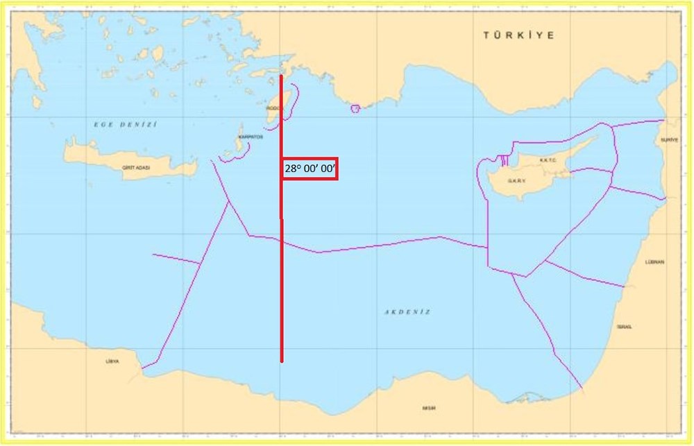 Ο χάρτης αποτυπώνει τον 28 Μεσημβρινό. Από εκεί και πέρα η Τουρκία συζητά το όριο της υφαλοκρηπίδας και μέχρι εκεί θεωρεί ότι όλη η ελληνική και κυπριακή υφαλοκρηπίδα είναι δική της.