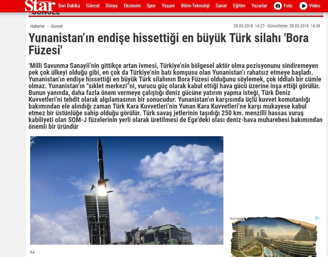 Σε μία άνευ προηγουμένου πρόκληση προχώρησε τη Δευτέρα η τουρκική εφημερίδα «Star» σε δημοσίευμα της για τον βαλλιστικό πύραυλο, Bora, που κατέχουν οι γείτονες και τους ισχυροποιεί σε στεριά, αέρα και θάλασσα.