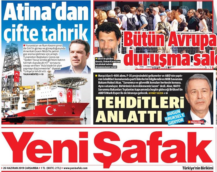 Η φιλοκυβερνητική εφημερίδα Yeni Safak κυκλοφορεί στην Τουρκία με τίτλο: “Διπλή πρόκληση από την Αθήνα”.