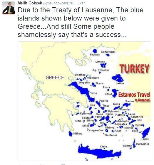 «Εξαιτίας της Συνθήκης της Λωζάννης, τα μπλε νησιά που φαίνονται παρακάτω δόθηκαν στην Ελλάδα… Και υπάρχουν κάποιοι που ξεδιάντροπα λένε πως επρόκειτο για επιτυχία…» γράφει ο γνωστός για τις κατά καιρούς προκλητικές θέσεις του, Τούρκος δήμαρχος.