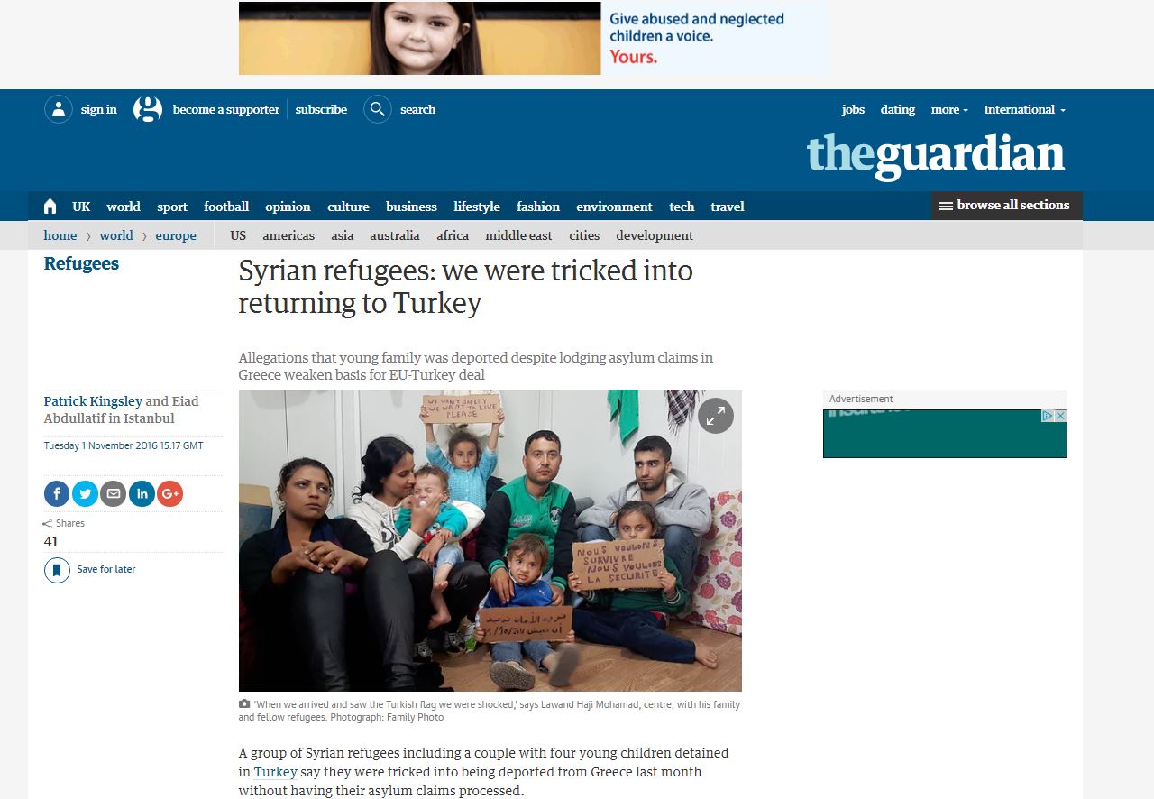 Ομάδα Σύρων προσφύγων – μεταξύ των οποίων και μία οικογένεια με 4 παιδιά – κατήγγειλαν στη βρετανική εφημερίδα, «Guardian» ότι ξεγελάστηκαν στην Ελλάδα και απελάθηκαν στην Τουρκία πριν καν εξεταστεί το αίτημα τους για άσυλο.