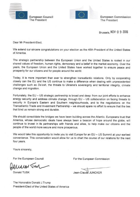 Σε κοινή τους συγχαρητήρια επιστολή προς τον Τραμπ, Γιούνκερ και Τουσκ τον «προσκαλούν να επισκεφθεί την Ευρώπη για μια συνάντηση κορυφής ΕΕ-ΗΠΑ», διότι είναι «πιο σημαντική από ποτέ η ενίσχυση των διατλαντικών σχέσεων».