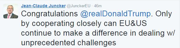 Ο πρόεδρος της Ευρωπαϊκής Επιτροπής Ζαν-Κλοντ Γιούνκερ μέσω του λογαριασμού του στο twitter έδωσε συγχαρητήρια στον Ντόναλντ Τραμπ και σημείωσε παράλληλα ότι «μόνο με την στενή συνεργασία μπορούν η ΕΕ και οι ΗΠΑ να συνεχίσουν να κάνουν τη διαφορά στην αντιμετώπιση πρωτοφανών πρόκλησεων».