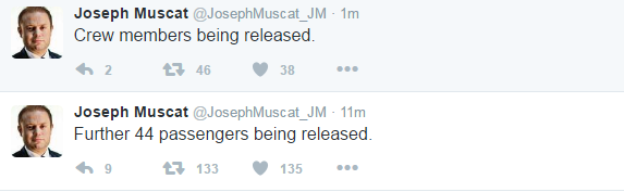 Άλλοι 44 επιβάτες αφέθηκαν ελεύθεροι, ανέφερε ο πρωθυπουργός της Μάλτας Τζόζεφ Μουσκάτ σε ανάρτησή του στο Twitter, και πρόσθεσε ότι αφέθηκαν ελεύθερα και τα μέλη του πληρώματος.