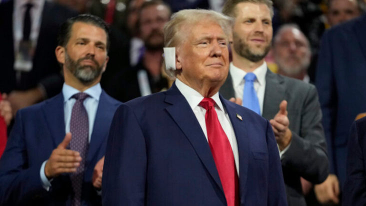 Ο Ντόναλντ Τραμπ δύο ημέρες αφότου επέζησε από την απόπειρα εναντίον του εμφανίστηκε θριαμβευτής στην εναρκτήρια βραδιά του Συνεδρίου των Ρεπουμπλικάνων με έναν επίδεσμο στο δεξί του αυτί.