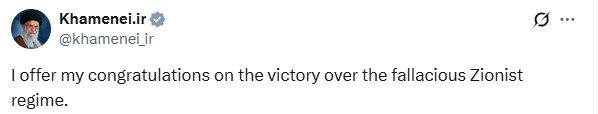 Σε ανάρτηση στο Χ ο Αλί Χαμενεΐ ανέφερε ότι «εκφράζω τα συγχαρητήρια μου για τη νίκη επί του παραπλανητικού σιωνιστικού καθεστώτος».