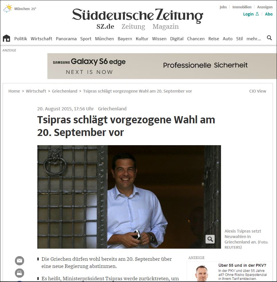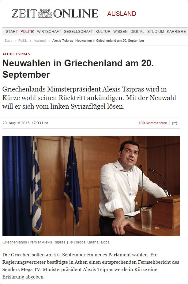H Die Zeit αναφέρει ότι «Οι Έλληνες θα εκλέξουν νέο Κοινοβούλιο στις 20 Σεπτεμβρίου. Ο πρωθυπουργός, Αλέξης Τσίπρας, προχωρά σε πρόωρες εκλογές για να εξασφαλίσει μια νέα, ισχυρή εντολή, πριν γίνουν αισθητές οι επιπτώσεις από το τρίτο πρόγραμμα λιτότητας».