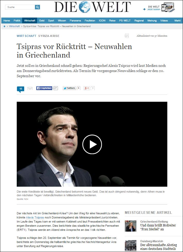 Η Frankfurter Allgemeine Ζeitung γράφει: «Ο Τσίπρας θέλει να παραιτηθεί-εκλογές στις 20 Σεπτεμβρίου». Σύμφωνα με τη FAZ, «ο Τσίπρας θέλει προφανώς να εδραιώσει την εξουσία του στη βάση, λίγο μετά το Ναι δωρητών στο νέο πακέτο ενίσχυσης».