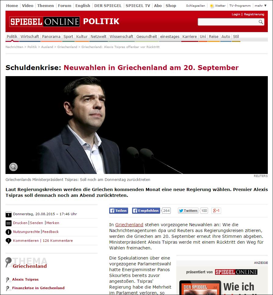 «Ο Τσίπρας πριν από την παραίτηση –εκλογές στην Ελλάδα» γράφει το Der Spiegel. «Με τις εκλογές ο Τσίπρας θα μπορέσει να ξεκαθαρίσει το ζήτημα της εξουσίας στο ίδιο του το κόμμα, τον ΣΥΡΙΖΑ. Η ριζοσπαστική αριστερή πτέρυγα του ΣΥΡΙΖΑ είχε αρνηθεί να ακολουθήσει τον πρωθυπουργό στις ψηφοφορίες για τις διασώσεις και το σχέδιο λιτότητας» εκτιμά το γερμανικό περιοδικό.