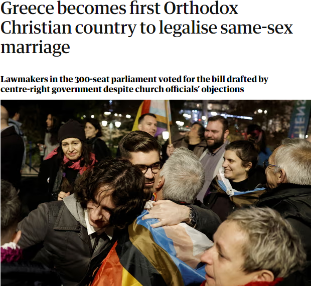 «Η Ελλάδα έγινε η πρώτη ορθόδοξη χώρα που νομιμοποίησε τους γάμους ομοφύλων», είναι το κεντρικό θέμα στον Guardian μετά την ψήφιση του νομοσχεδίου, ενώ και άλλα διεθνή μέσα φαίνεται να έχουν ρίξει όλα τους τα φώτα στην Ελλάδα και το ιστορικό αυτό βήμα για τα δικαιώματα.