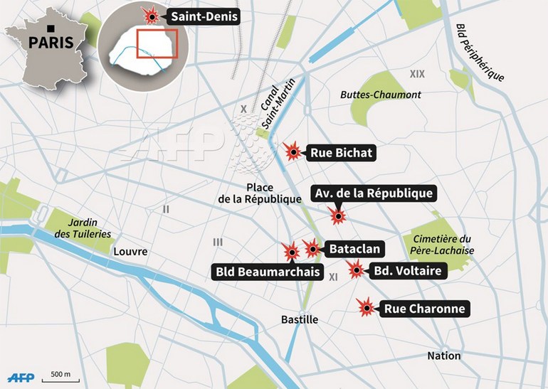 Στο Παρίσι η αστυνομική διεύθυνση κατέγραψε πολλές επιθέσεις ενόπλων, στο Μπισά (10ο διαμέρισμα) και στη Ρι ντε Σαρόν (11ο διαμέρισμα), κοντά στην Πλας ντε λα Ρεπιμπλίκ.