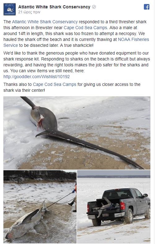 Η Υπηρεσία του Ατλαντικού Ωκεανού για τους Λευκούς Καρχαρίες ανέφερε έναν μεγάλο αριθμό νεκρών καρχαριών εξαιτίας του δριμύτατου ψύχους στο Cape Cod, γεγονός που καταγράφεται για πρώτη φορά στα ιστορικά.