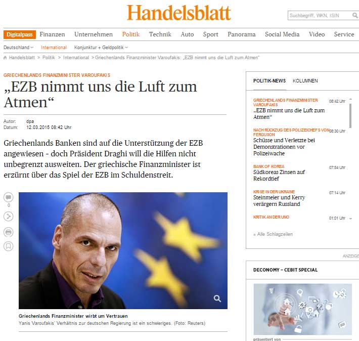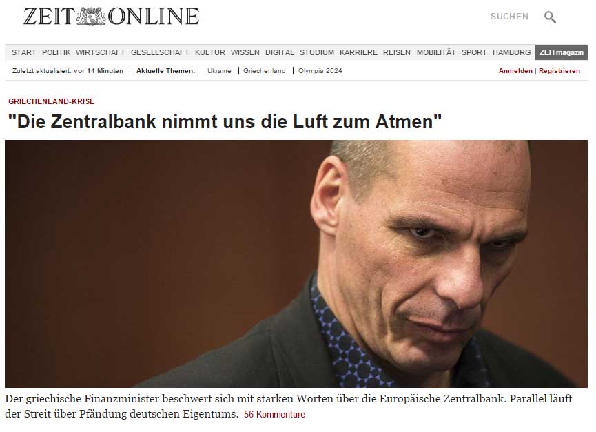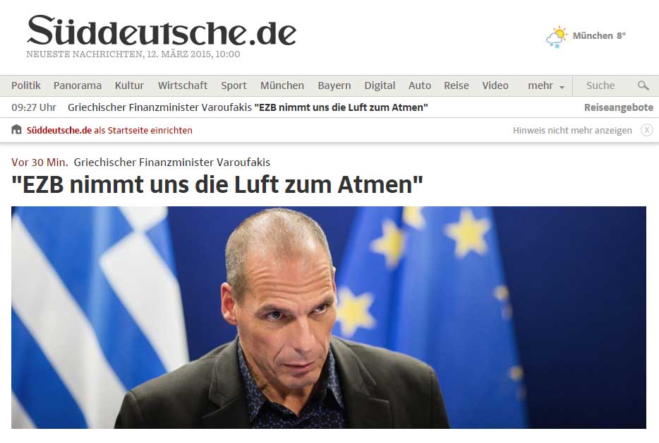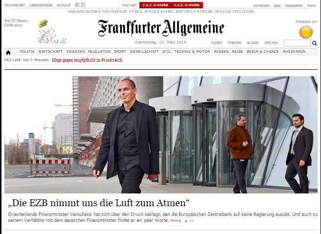 Η δήλωση Βαρουφάκη για ασφυκτική πίεση της ΕΚΤ στην ελληνική οικονομία απασχολεί το σύνολο του διεθνή και ιδιαίτερα του γερμανικού Τύπου λίγες ώρες πριν την συνάντηση του Έλληνα Πρωθυπουργού με το Ζαν Κλοντ Γιούνκερ.