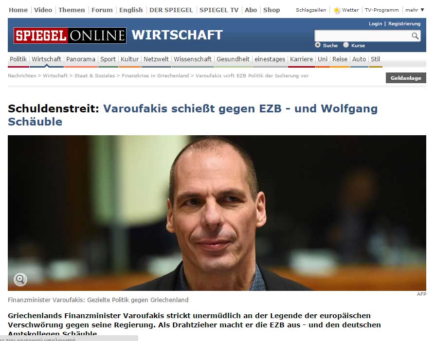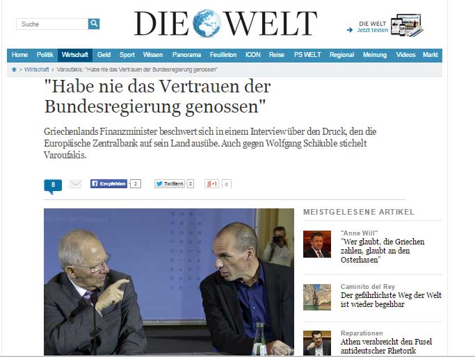 Στα δημοσιεύματα υπογραμμίζονται οι αναφορές του Έλληνα υπουργού Οικονομικών για τον Γερμανό ομόλογό του, Βόλφγκανγκ Σόιμπλε, ο οποίος, όπως δήλωσε ο Γιάνης Βαρουφάκης, τον ενημέρωσε ότι «οι Γερμανοί πολίτες δεν τον εμπιστεύονταν» σημειώνοντας την απάντηση του ότι «ποτέ δεν με εμπιστεύονταν, ωστόσο έχω την εμπιστοσύνη του ελληνικού λαού».