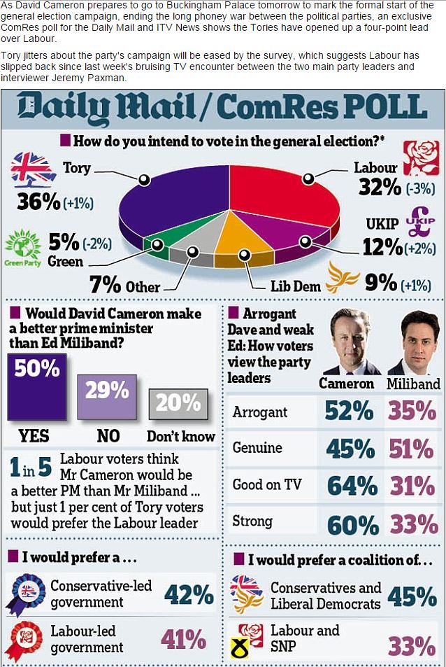Ενόψει των βουλευτικών εκλογών της 7ης Μαΐου, η δημοσκόπηση εμφανίζει τους Συντηρητικούς να λαμβάνουν το 36% στην πρόθεση της ψήφου, τους Εργατικούς το 32%, του Φιλελεύθερους Δημοκρατικούς το 9%, το αντιευρωπαϊκό UKIP το 12% και τους Πράσινους το 5%.